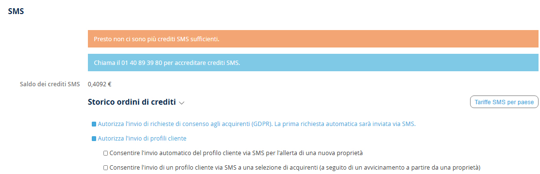 Tutti i negoziatori con diritti di amministratore hanno l'opzione SMS attivata di default e in modo illimitato (fino a quando il credito dell'agenzia non è esaurito).