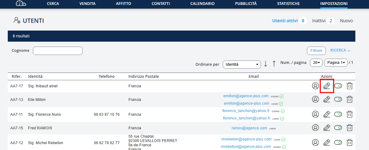In Impostazioni -> Utenti (scegli l'utente per il quale vuoi abilitare l'uso degli SMS.) Per creare un nuovo utente, puoi fare riferimento alla sezione "Impostazioni") -> clicca sulla penna a destra -> Moduli -> Poi seleziona la sezione Gestione SMS.