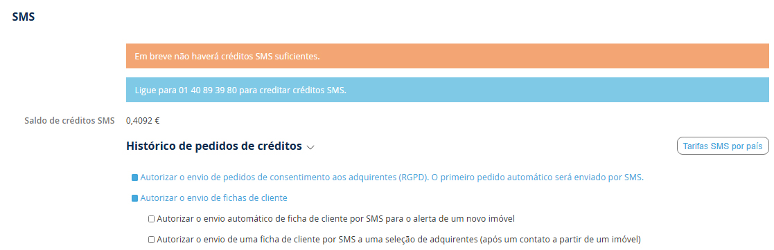 « 60% dos seus clientes são utilizadores móveis » Basta ligar-nos para o 01.40.89.39.80 para creditar a sua agência com SMS. Pode consultar o saldo da sua agência no canto superior direito (visível apenas se for administrador).