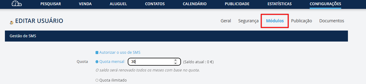Em Definições -> Utilizadores (escolha o utilizador para o qual pretende autorizar o uso de SMS.) Para criar um novo utilizador, pode consultar a secção "Definições") -> clique na caneta à direita -> Módulos -> Depois vá à secção Gestão de SMS.