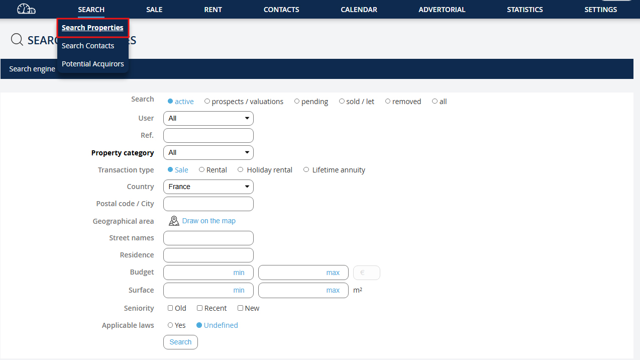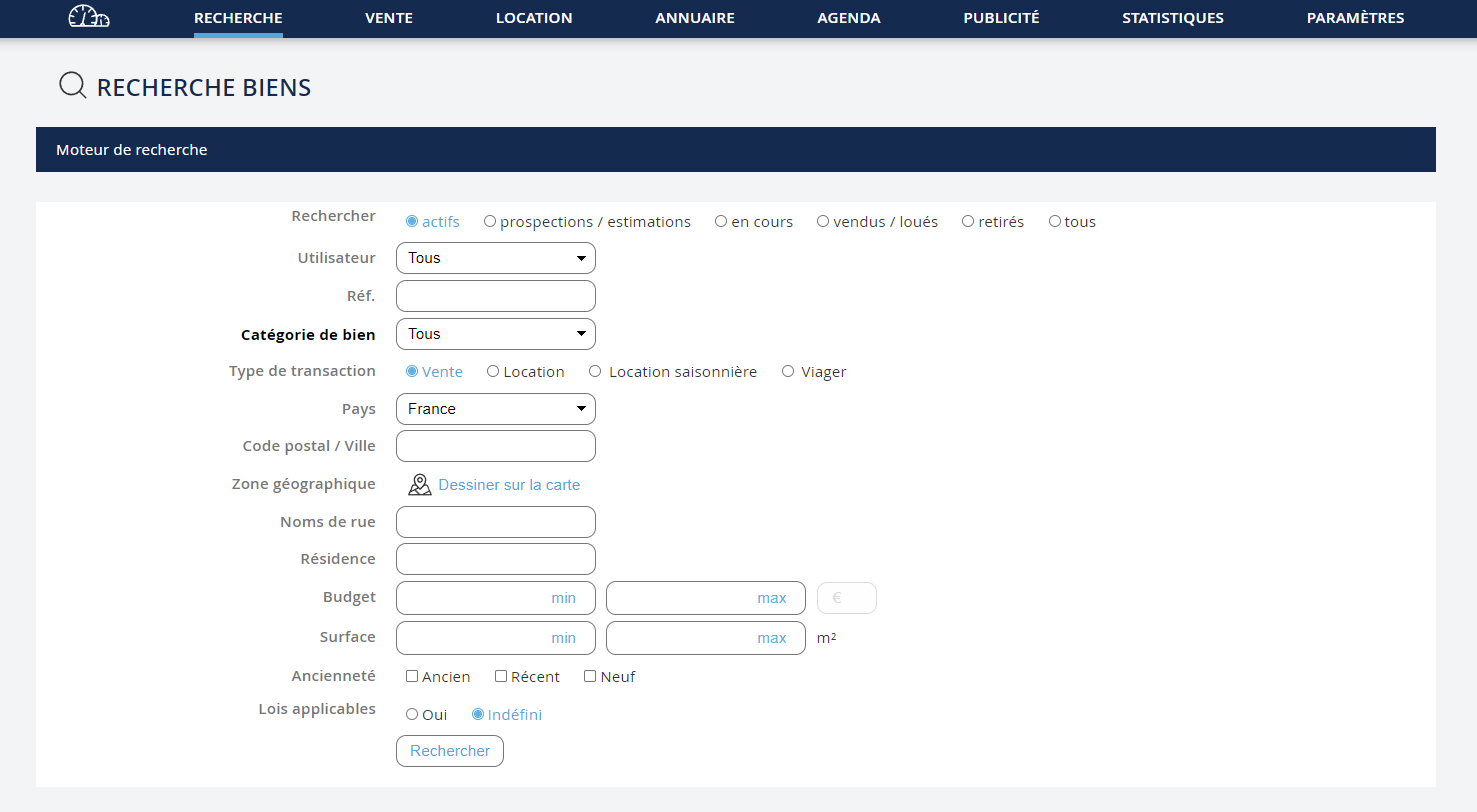 Allez dans le menu déroulant "Recherche" puis cliquez sur "Rechercher biens".