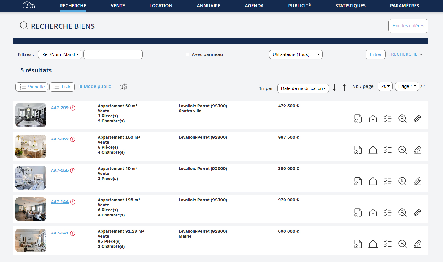 Vous pouvez rechercher des biens dans les catégories suivantes : - Actif - Prospections / estimations - En cours - Vendus / loués - Retirés