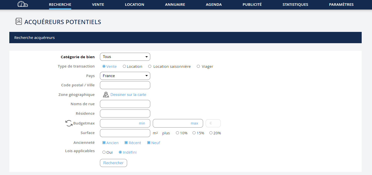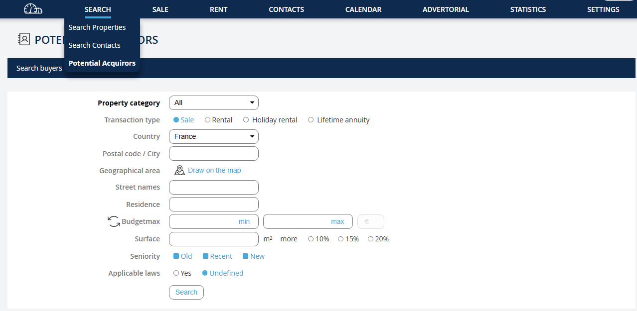 Cette fonctionnalité a été développée pour montrer à un nouveau propriétaire qu’il peut vous confier son bien car vous avez d’ores et déjà un grand nombre d’acquéreurs potentiellement intéressés. Allez dans le menu déroulant "Recherche" puis cliquez sur "Rechercher un acquéreur".