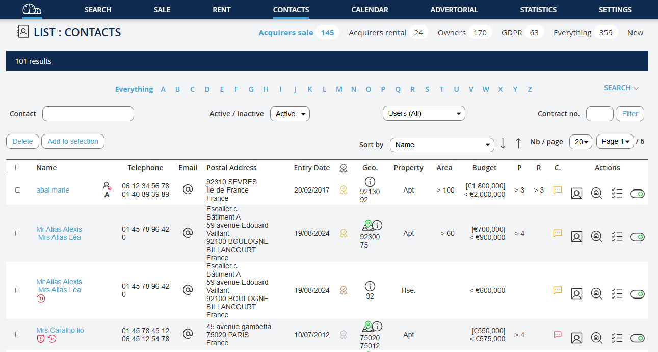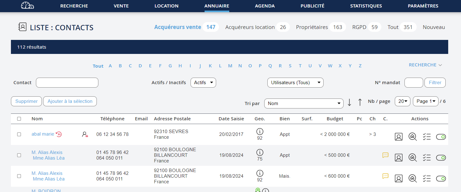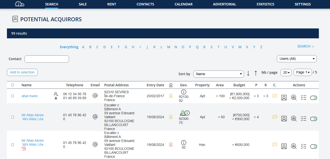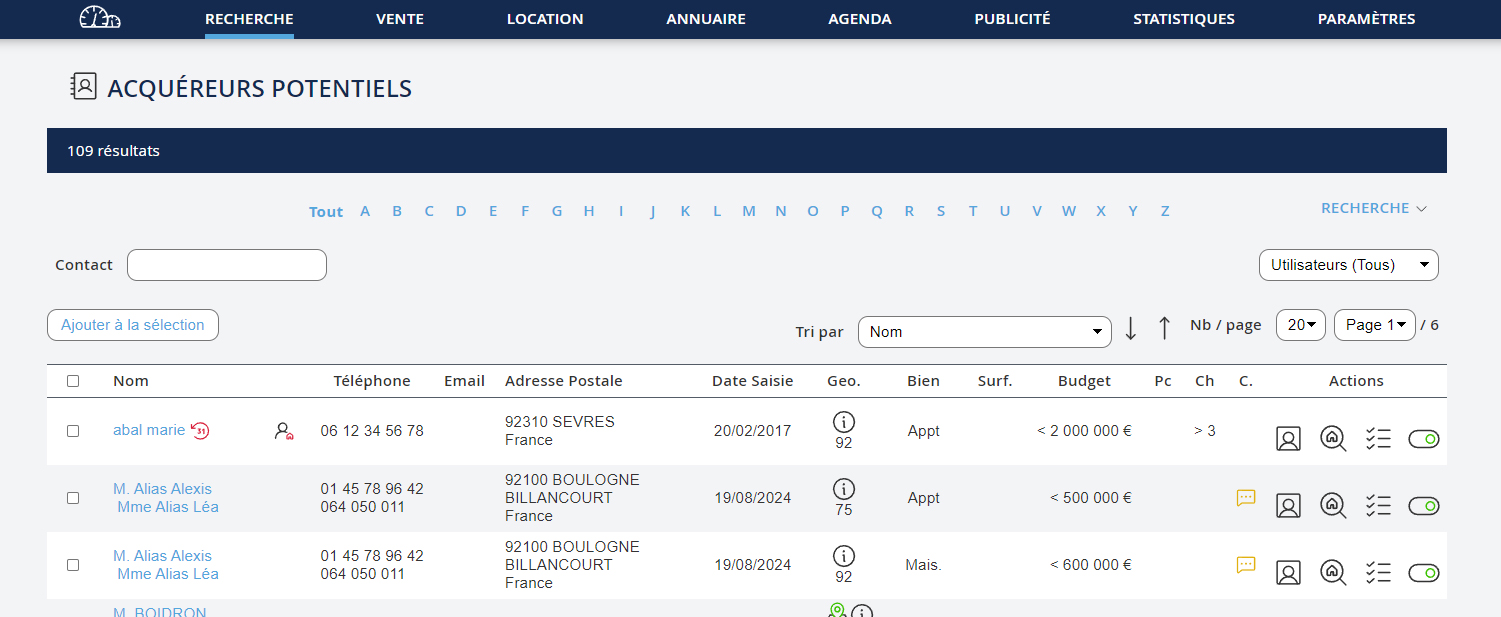 Il y a 3 types de recherche possible : - Rechercher un bien soit par sa référence ou par des critères de prix, localisation, pièces etc - Rechercher un contact par son nom, numéro de téléphone ou mail - Rechercher des acquéreurs potentiels, combien de clients avez-vous enregistrés dans votre base de donnéeclients acquéreurs, qui pourraient correspondre au bien que vous rentrez ?