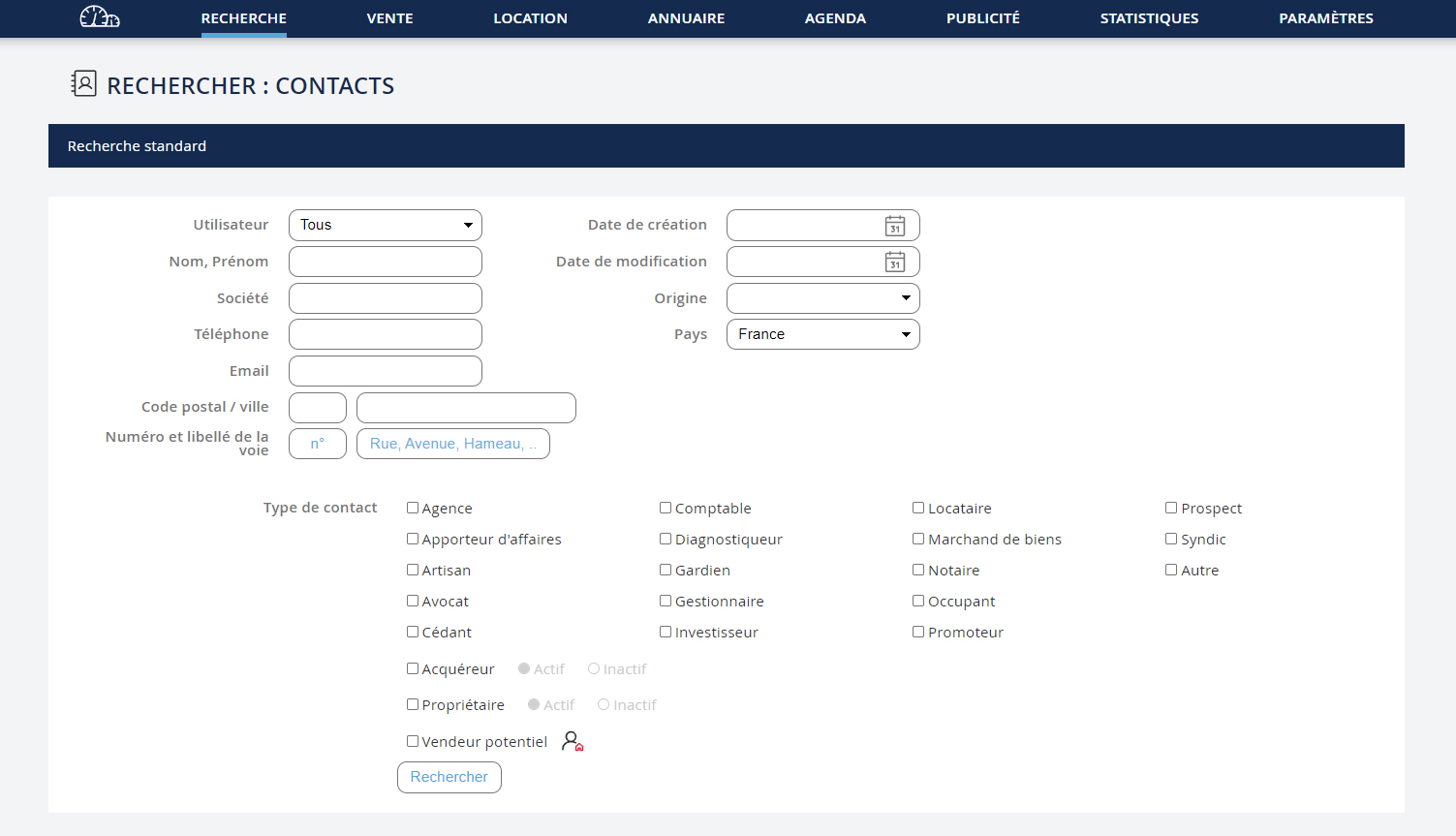 Cette fonctionnalité a été développée pour rechercher un contact par son nom, son téléphone, son mail… Vous pouvez également faire une recherche par type de contact (agence, notaire, investisseur...). Allez dans le menu déroulant "Recherche" puis cliquez sur "Rechercher un contact".