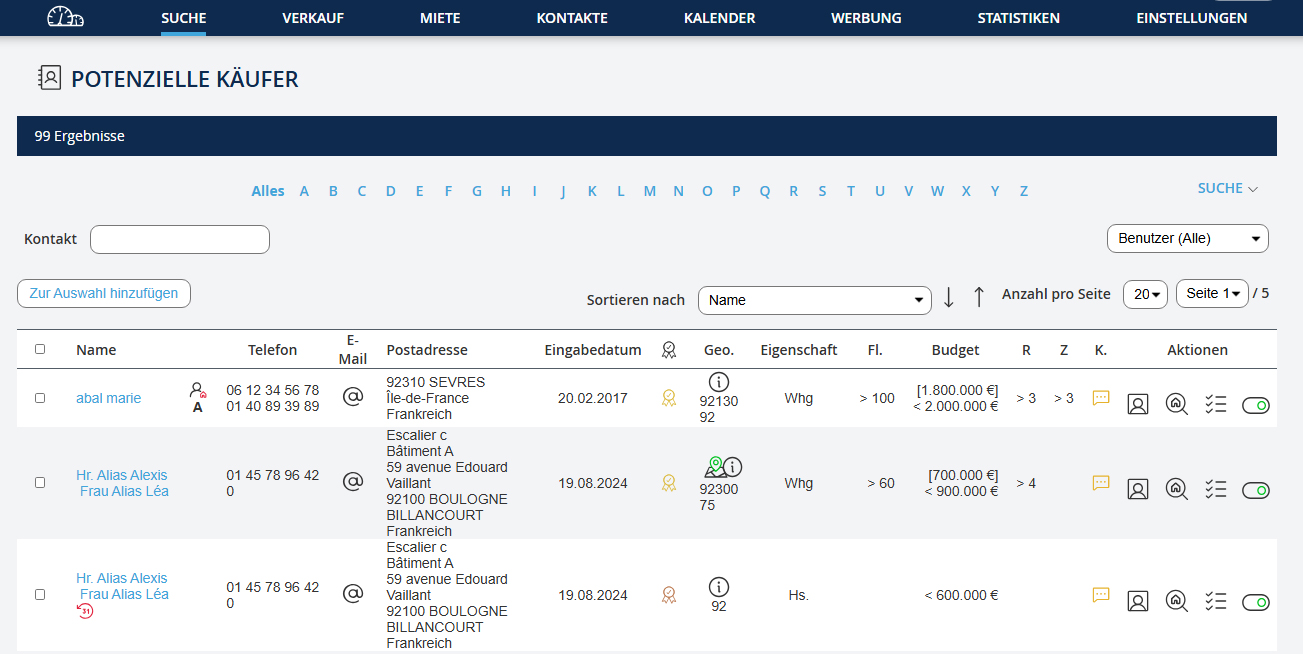 Es gibt 3 Arten von möglichen Suchen: - Nach einer Immobilie suchen entweder nach ihrer Referenz oder nach Kriterien wie Preis, Standort, Zimmer usw. - Nach einem Kontakt suchen nach Name, Telefonnummer oder E-Mail. - Nach potenziellen Käufern suchen, wie viele Kunden haben Sie in Ihrer Datenbank registriertKundenkäufer, die möglicherweise zu der Immobilie passen, die Sie einstellen?