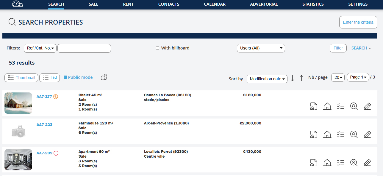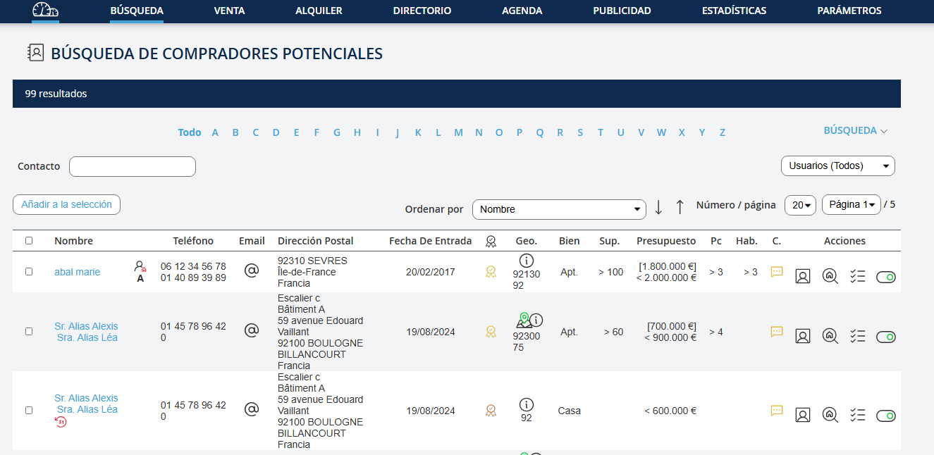 There are 3 types of possible searches: - Search for a property either by its reference or by criteria such as price, location, rooms, etc. - Search for a contact by their name, phone number, or email. - Search for potential buyers, how many clients have you recorded in your databasebuyer clients, who might match the property you are listing?