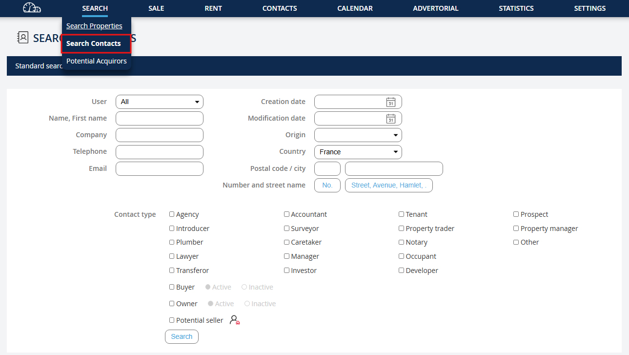 This feature was developed to search for a contact by their name, phone number, or email… You can also search by contact type (agency, notary, investor...). Go to the dropdown menu "Search" and click on "Search for a contact".
