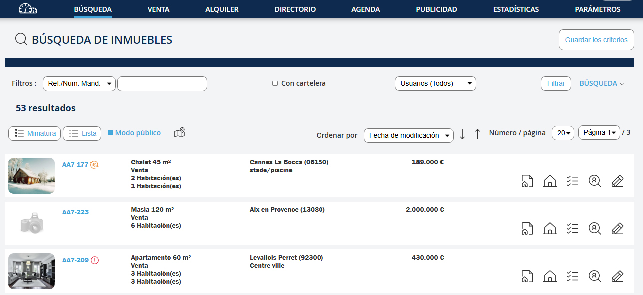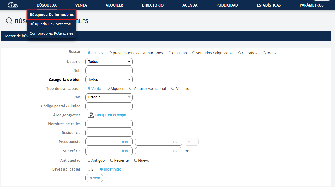 En la ventana de resultados, puedes: Modificar tu búsqueda: 1. Haz clic en el enlace "Búsqueda" 2. Modifica los campos 3. Haz clic en el botón "Buscar" Modificar tu búsqueda: Cf.: Guardar un comprador desde la búsqueda de una propiedad
