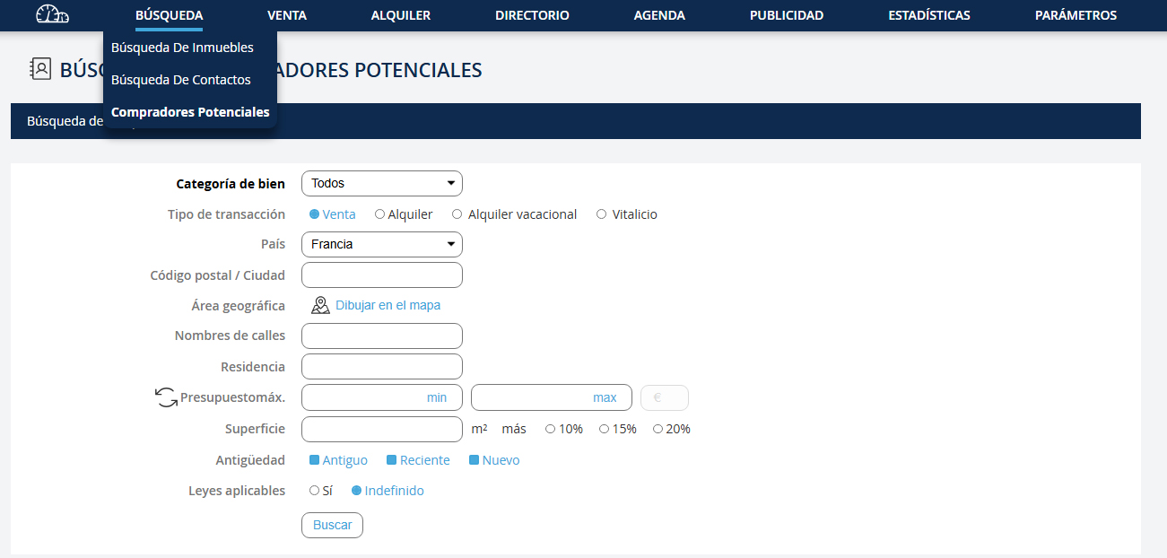 Esta funcionalidad fue desarrollada para mostrar a un nuevo propietario que puede confiarle su propiedad porque ya tiene un gran número de compradores potencialmente interesados. Vaya al menú desplegable "Búsqueda" y haga clic en "Buscar un comprador".