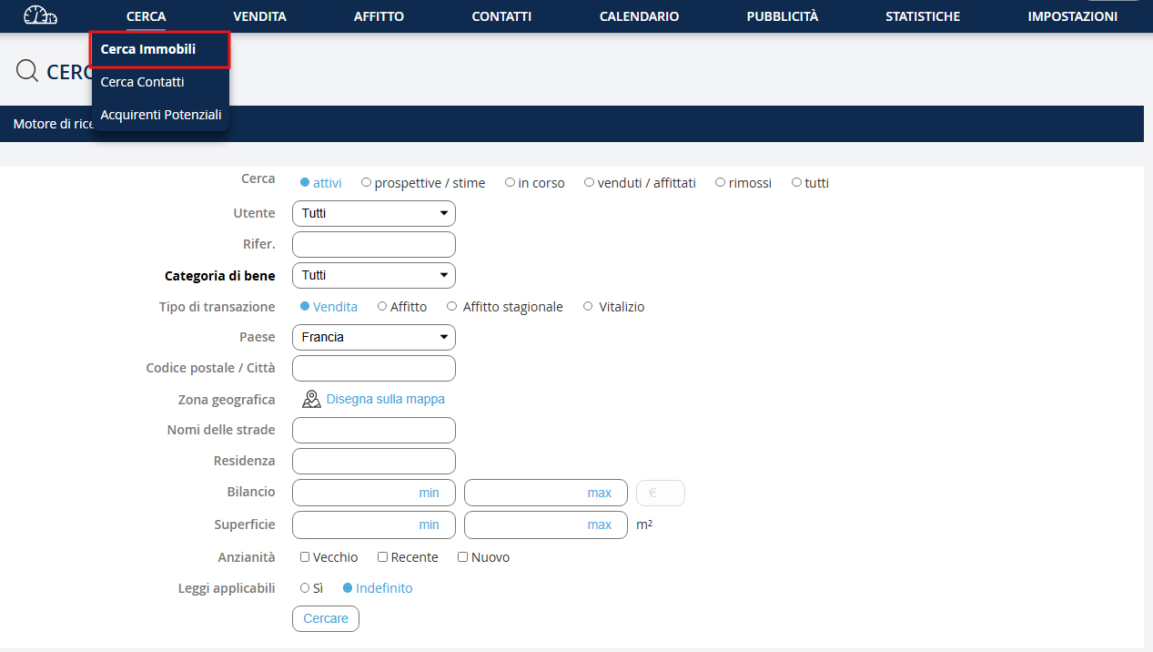 Vai nel menu a tendina "Ricerca" e clicca su "Cerca immobili".