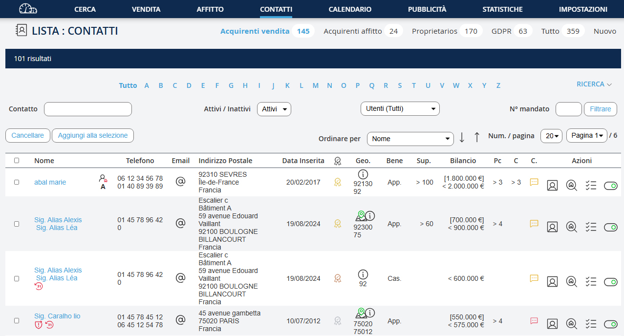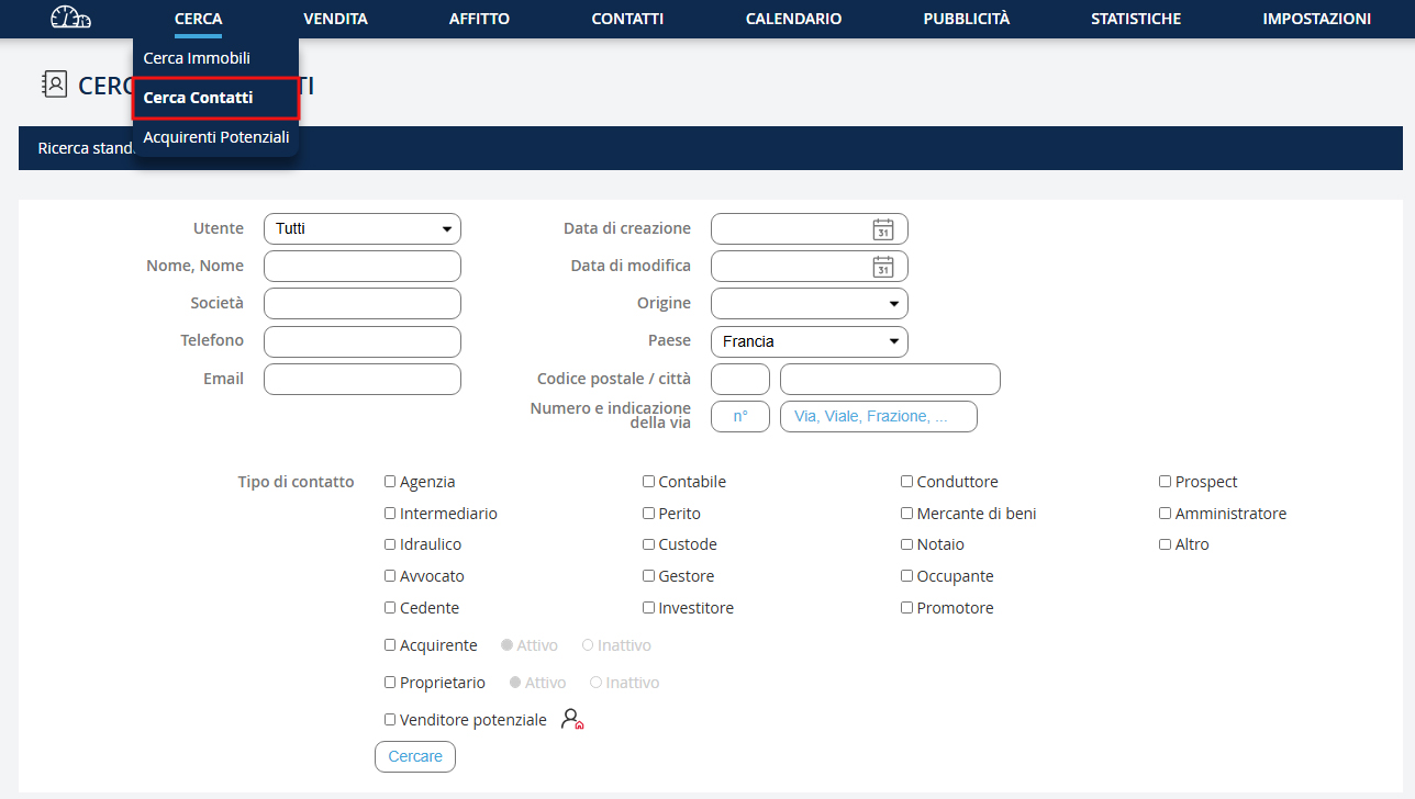 Questa funzionalità è stata sviluppata per cercare un contatto tramite nome, telefono o e-mail… Puoi anche cercare per tipo di contatto (agenzia, notaio, investitore...). Vai nel menu a discesa "Ricerca" e clicca su "Cerca un contatto".
