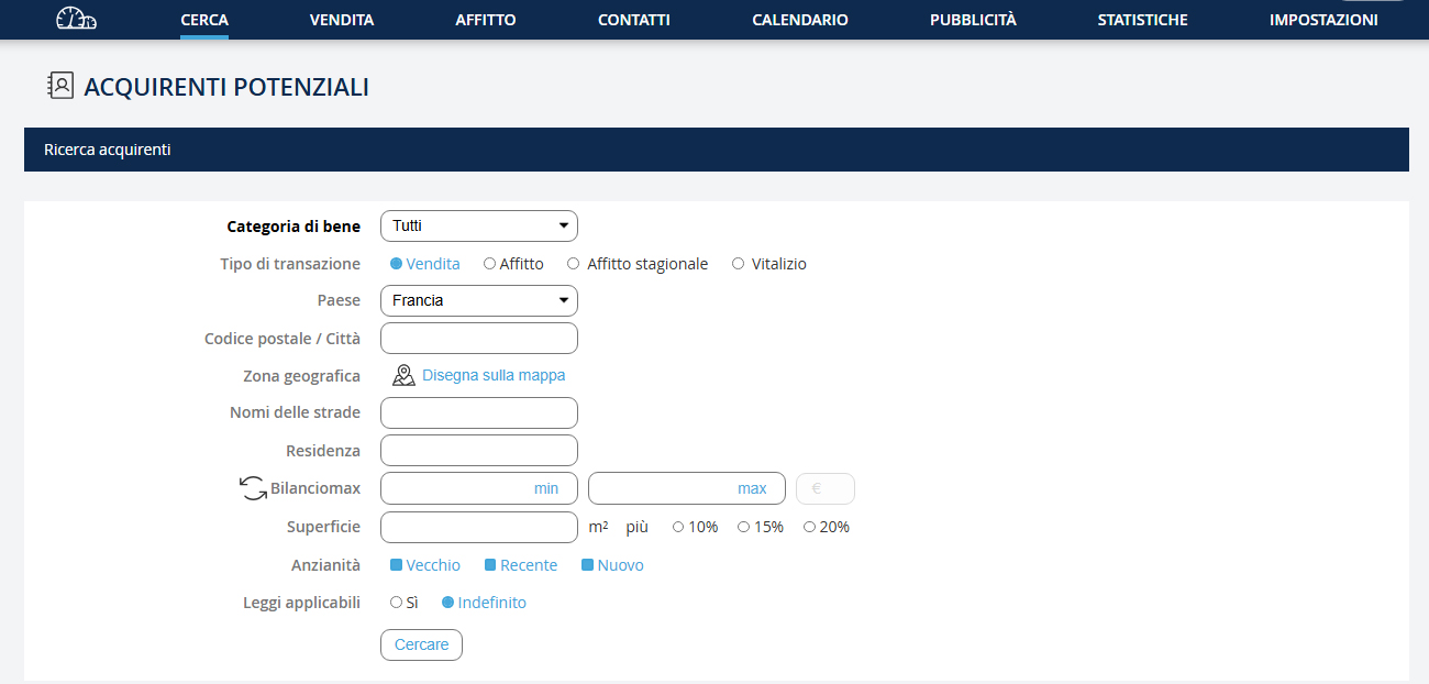 Questa funzionalità è stata sviluppata per mostrare a un nuovo proprietario che può affidarti la sua proprietà perché hai già un gran numero di acquirenti potenzialmente interessati. Vai nel menu a discesa "Ricerca" e clicca su "Cerca un acquirente".