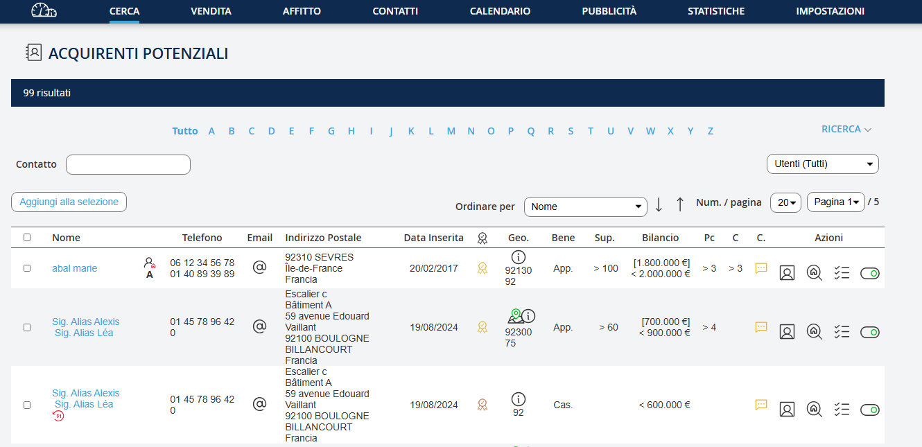 Ci sono 3 tipi di ricerca possibili: - Cercare una proprietà sia per riferimento o per criteri come prezzo, posizione, stanze, ecc. - Cercare un contatto per nome, numero di telefono o e-mail. - Cercare potenziali acquirenti, quanti clienti hai registrato nel tuo databaseclienti acquirenti che potrebbero corrispondere alla proprietà che stai inserendo?