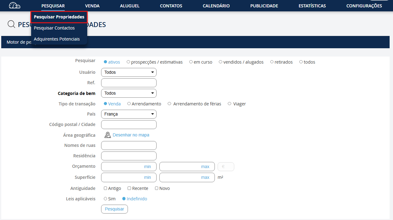 Vá ao menu suspenso "Pesquisa" e clique em "Pesquisar imóveis".