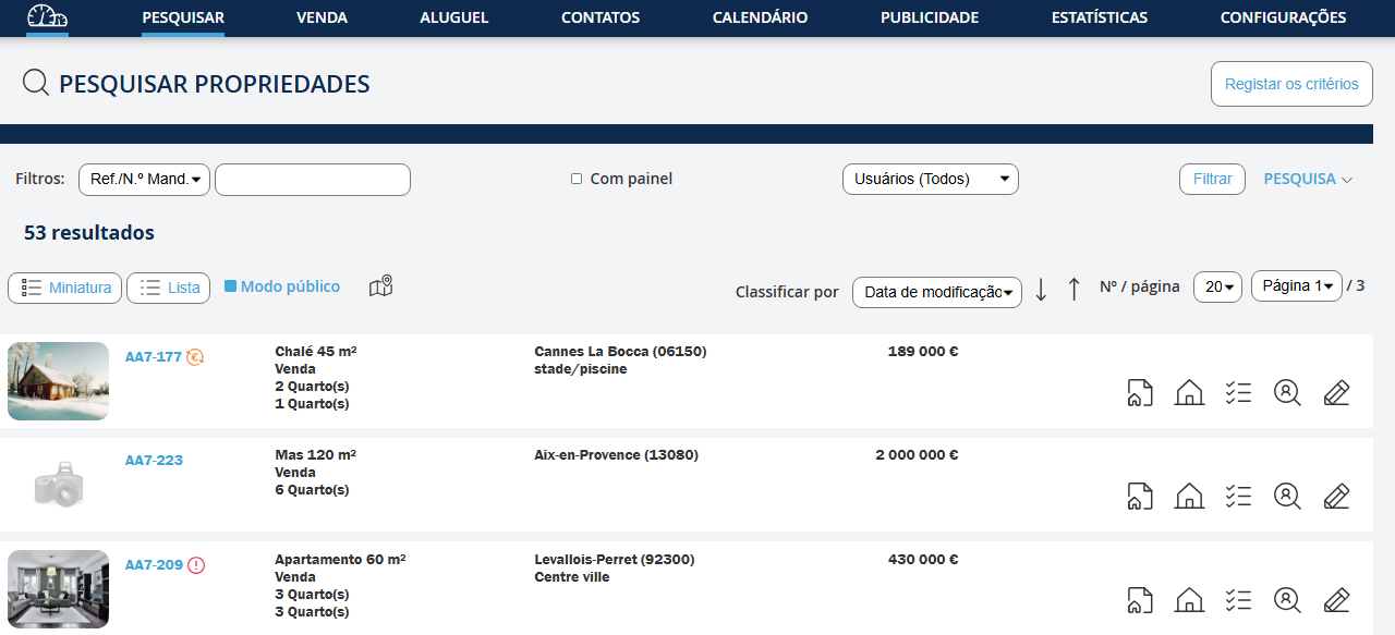 Na janela de resultados, você pode: Modificar a sua pesquisa: 1. Clique no link "Pesquisa" 2. Modifique os campos 3. Clique no botão "Pesquisar" Modificar a sua pesquisa: Cf.: Gravar um comprador a partir da pesquisa de um imóvel