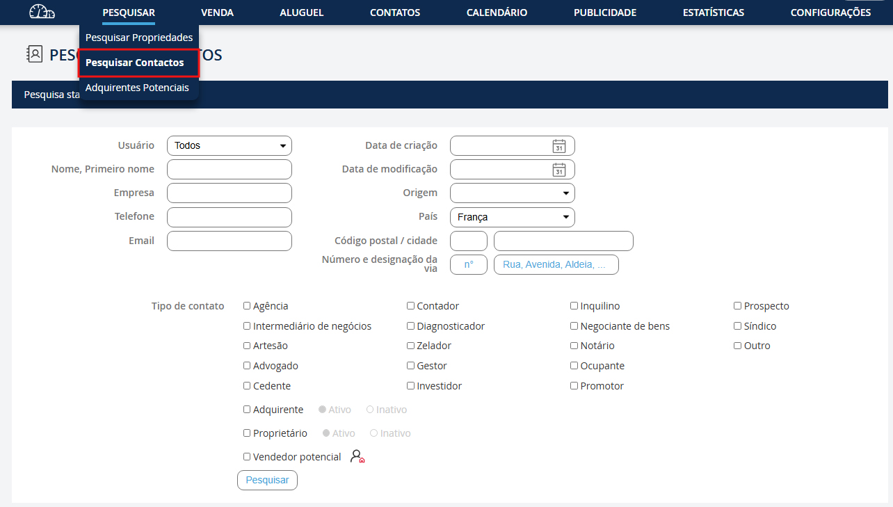 Esta funcionalidade foi desenvolvida para procurar um contato pelo nome, telefone ou e-mail… Você também pode procurar por tipo de contato (agência, notário, investidor...). Vá no menu suspenso "Pesquisa" e clique em "Pesquisar um contato".