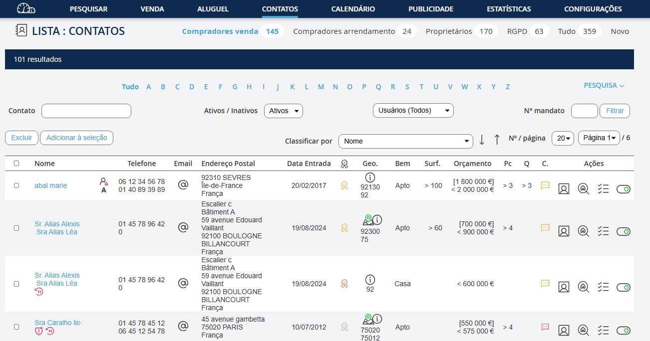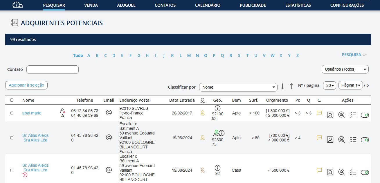 Existem 3 tipos de pesquisa possíveis: - Procurar um imóvel seja pela sua referência ou por critérios como preço, localização, divisões, etc. - Procurar um contacto pelo nome, número de telefone ou e-mail. - Procurar compradores potenciais, quantos clientes tem registados na sua base de dadosclientes compradores que possam corresponder ao imóvel que está a inserir?