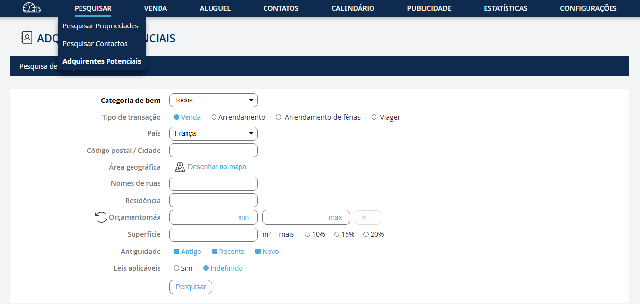 Esta funcionalidade foi desenvolvida para mostrar a um novo proprietário que pode confiar-lhe o seu imóvel porque já tem um grande número de compradores potenciais interessados. Vá no menu suspenso "Pesquisa" e clique em "Pesquisar um comprador".