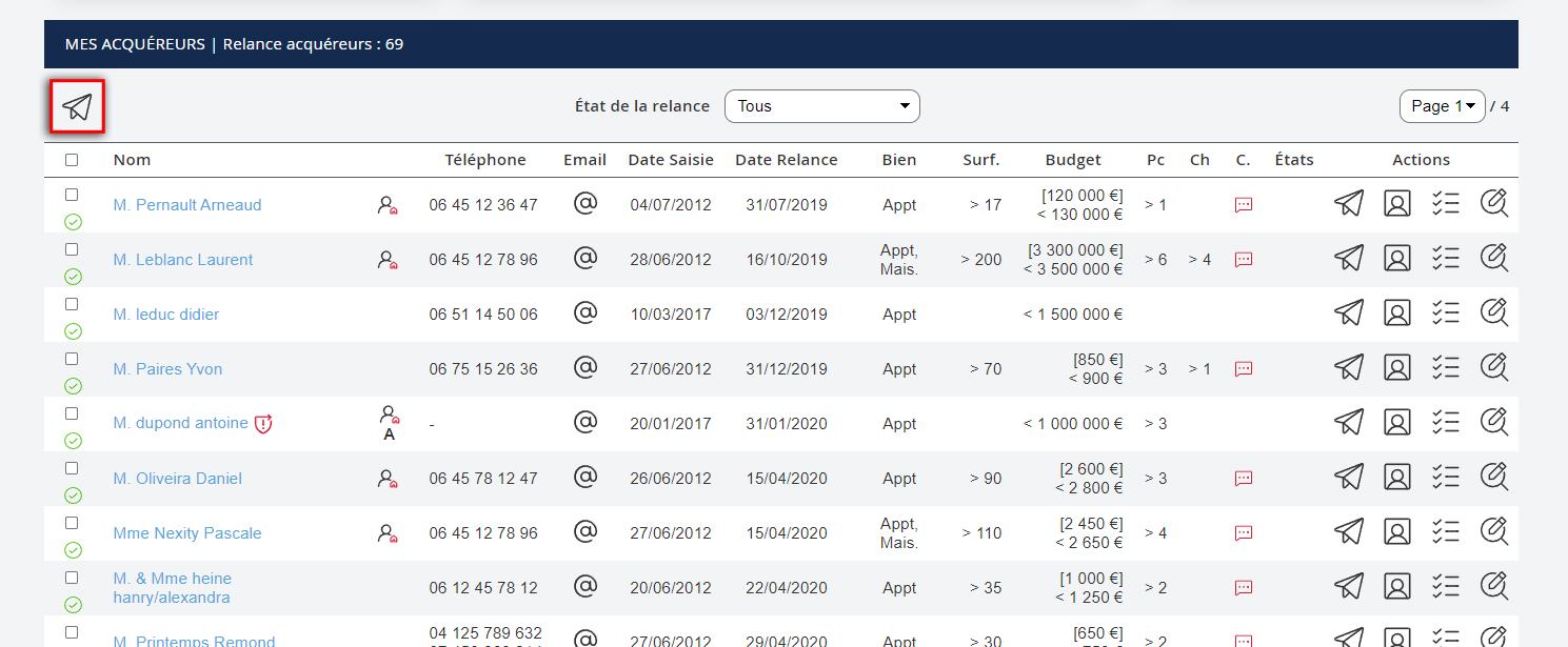 En cliquant sur « Relance acquéreurs » vous arrivez sur le tableau des clients à relancer.