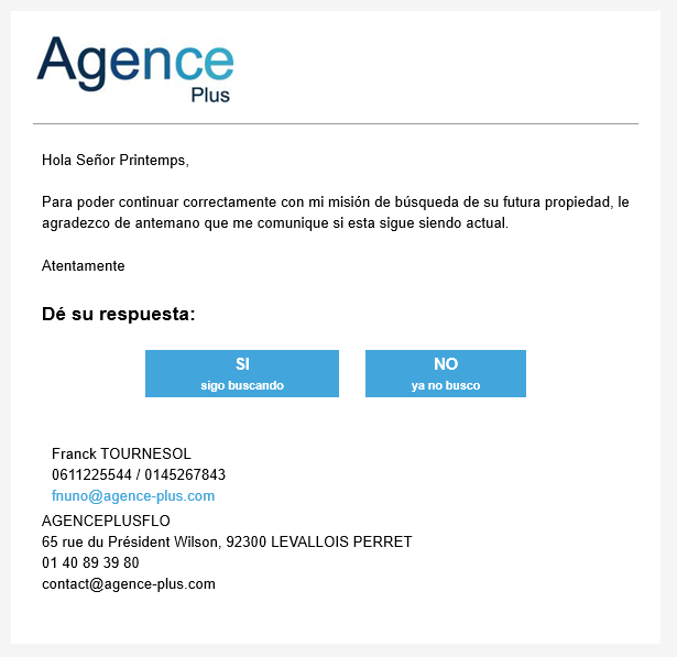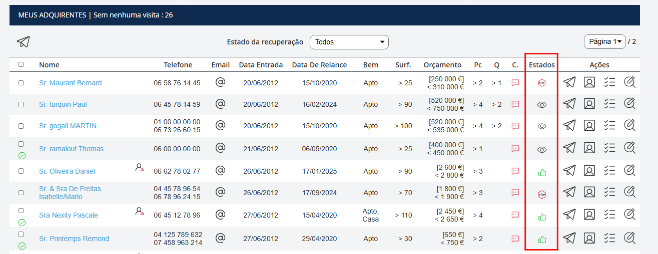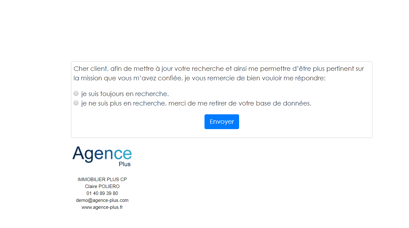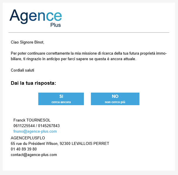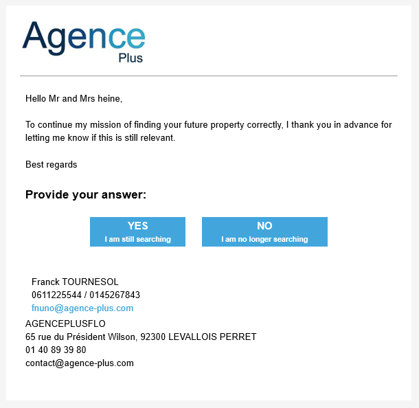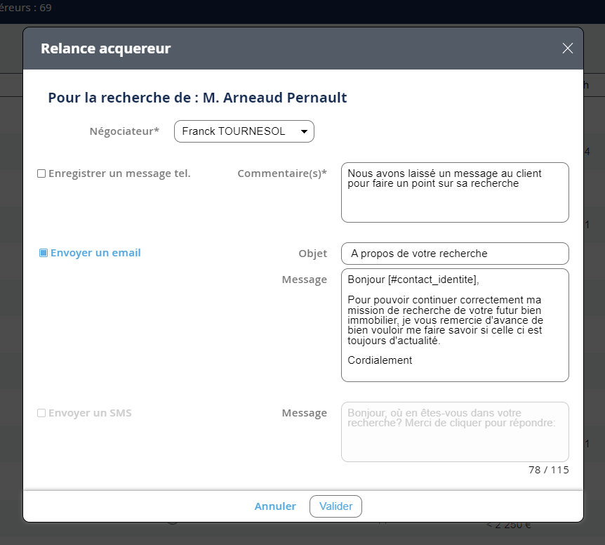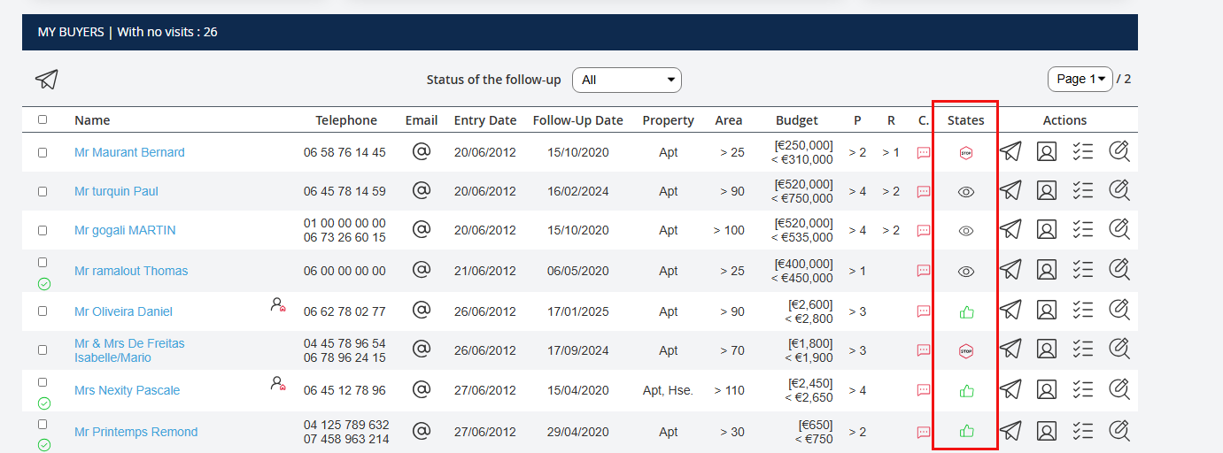 signifie que vous avez effectué votre relance acquéreurs par mail/sms, il reste dans ce listing tant que le client n’a pas répondu ou que vous n’avez pas modifié la date de relance. Vous l’aurez compris il est important d’informer vos clients acquéreurs de l’importance de vous donner une réponse pour vous aider à mettre à jour vos fichiers clients.