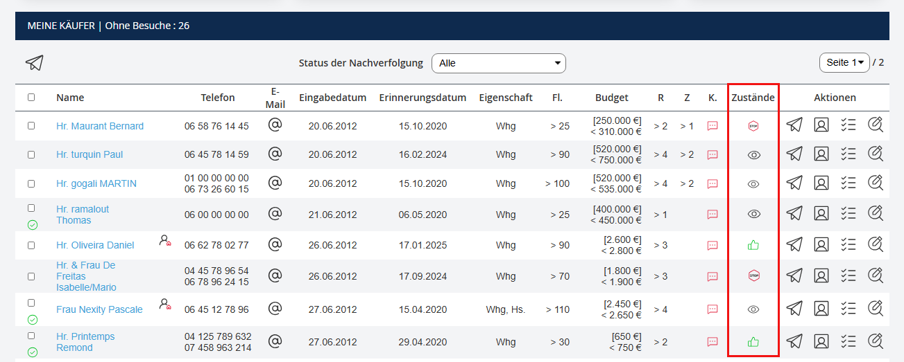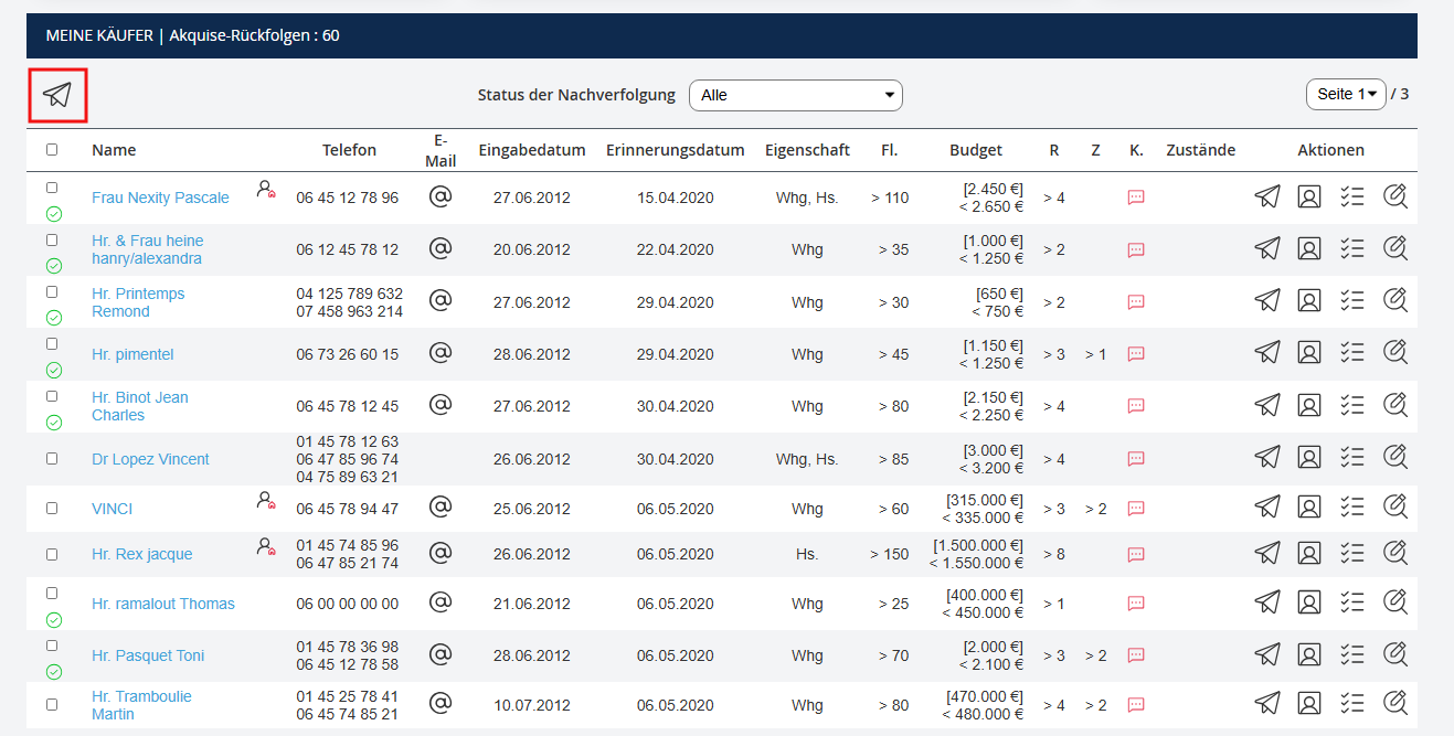 bedeutet, dass Sie Ihre Käufererinnerung per E-Mail/SMS durchgeführt haben, und sie bleibt in dieser Liste, bis der Kunde geantwortet hat oder Sie das Erinnerungsdatum geändert haben. Sie haben es verstanden, es ist wichtig, Ihre Käufer darüber zu informieren, wie wichtig es ist, Ihnen eine Antwort zu geben, um Ihnen zu helfen, Ihre Kundendateien zu aktualisieren.
