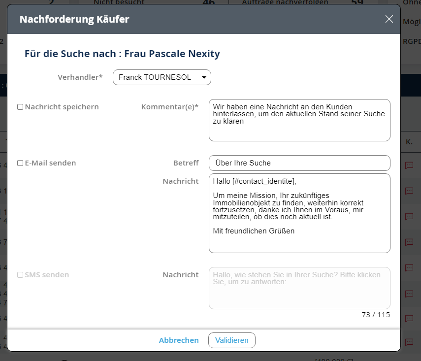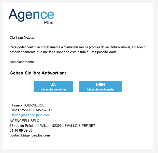 Wenn das Feld ausgegraut ist, bedeutet dies, dass die Handynummer nicht im Kontaktformular ausgefüllt wurde. Es könnte auch bedeuten, dass Sie kein SMS-Guthaben mehr haben (in diesem Fall überprüfen Sie bitte Ihr Kundenformular und bei fehlendem SMS-Guthaben können Sie eine E-Mail an contact@agence-plus.com schreiben, um Ihr Konto wieder aufzuladen).