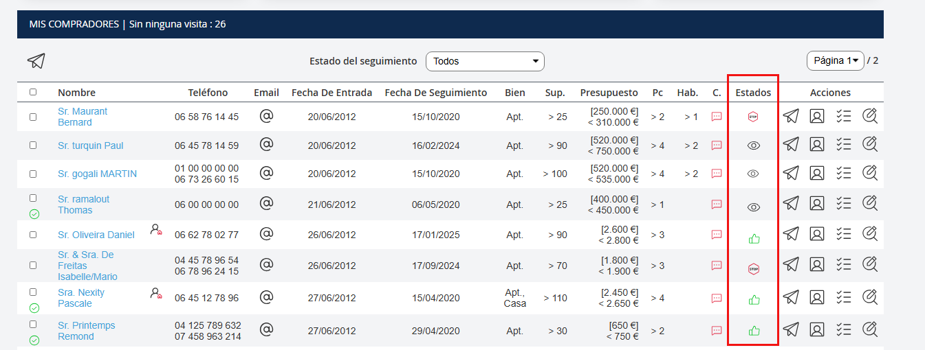 Si su cliente ha respondido o visto su correo electrónico/SMS, podrá encontrar estas indicaciones en la columna Estados.