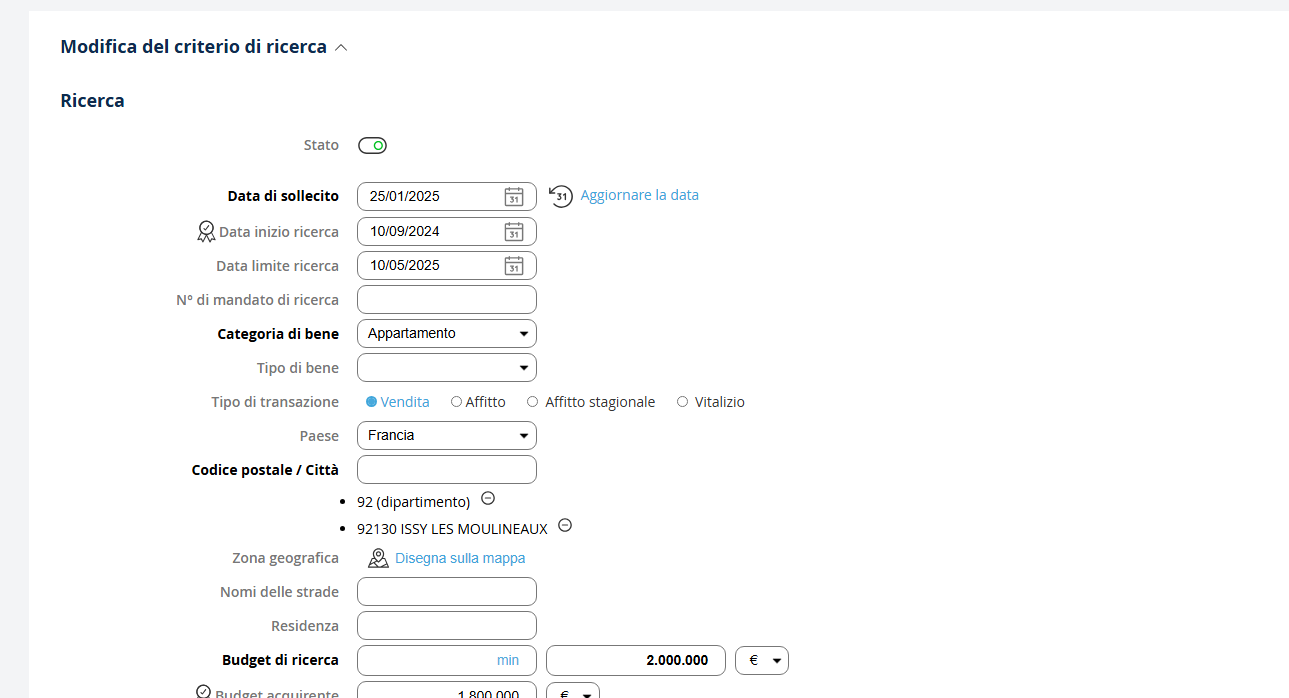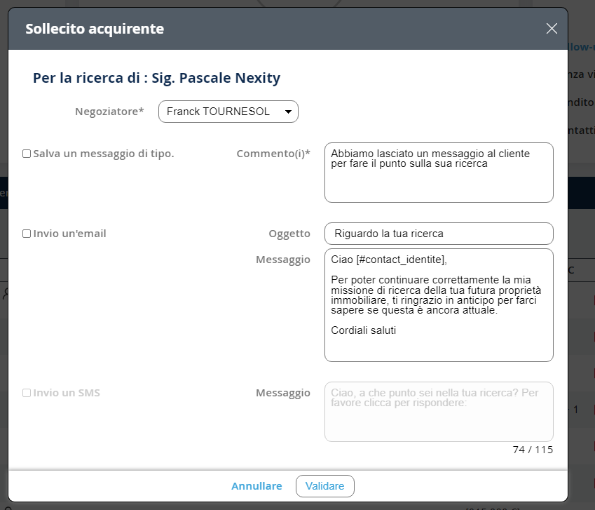 di monitoraggio funzioni, non devi convalidare "data di follow-up non obbligatoria" e scegliere un numero di giorni prima del follow-up acquirente per vendita (Impostazioni agenzia -> Configurazione -> Monitoraggio client).