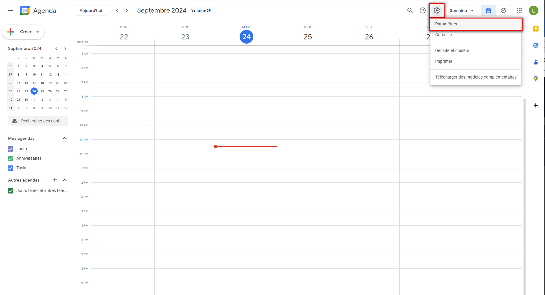 - Ensuite, ouvrez votre agenda Google et cliquez sur "Paramètres"