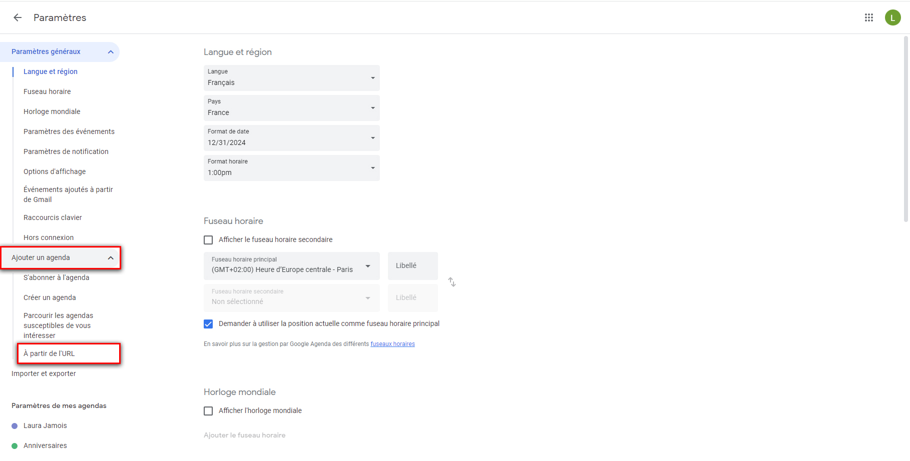 - Cliquez sur "Ajouter un agenda", puis sur "A partir de l'URL"