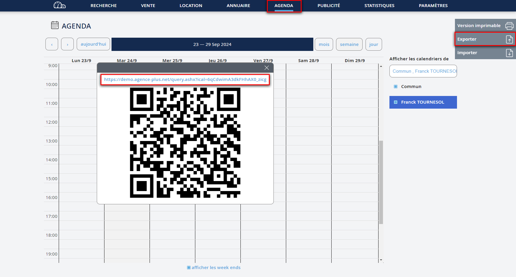 - Fügen Sie die URL des Kalenders ein, die Sie über die Schaltfläche "Exportieren" im Agence Plus-Software erhalten haben.