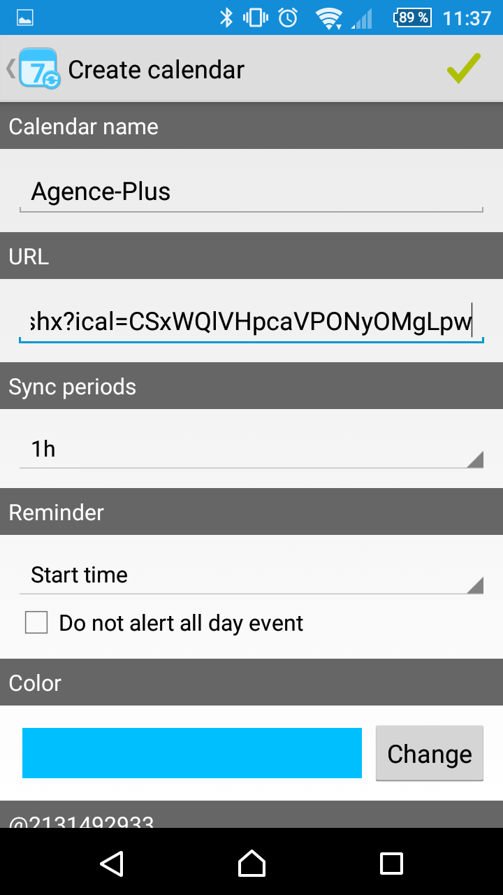 - Rellene el campo Calendar name con algo como "Agence-Plus" (este será el nombre que aparecerá en su aplicación de calendario de Android)